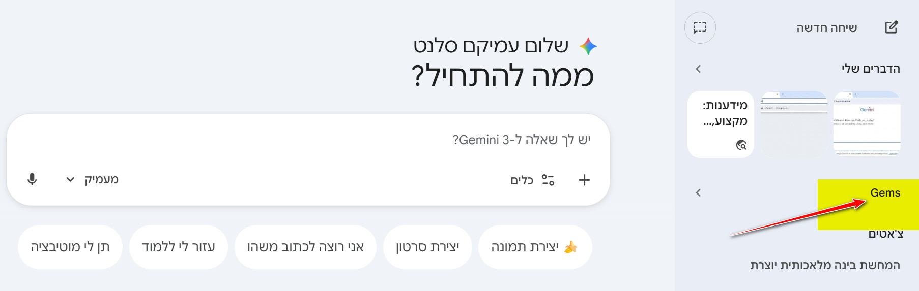 בתפריט הצד של GEMINI מצד ימין חפשו את הכפתור Gem