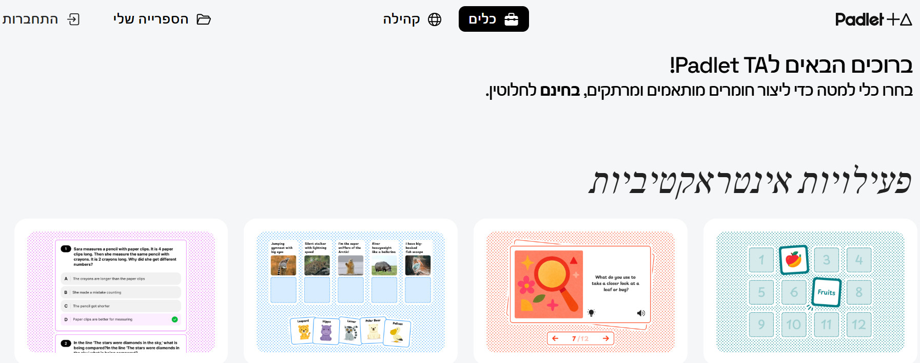 במיוחד ראוי לציין את Padlet TA כלי נפרד בכתובת ta.padlet.com שמייצר דפי עבודה, חומרי הוראה ואינטראקטיביים מוכנים לשימוש (printables worksheets וכו’ ) עם אפשרות התאמה למורה